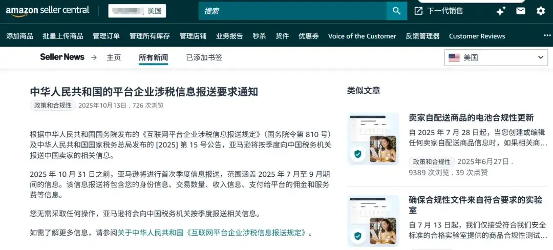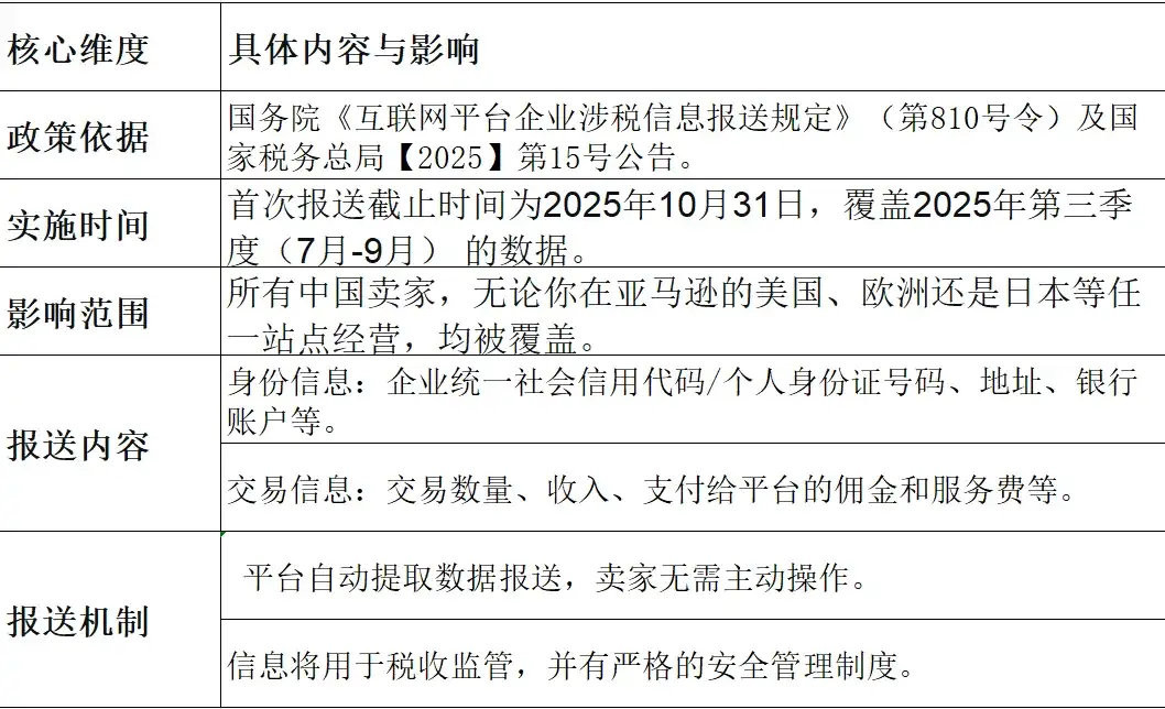 根据中华人民共和国国务院发布的《互联网平台企业涉税信息报送规定》及国家税务总局[2025]第15号公告,亚马逊将按季度向中国税务机关报送中国卖家的详细信息。